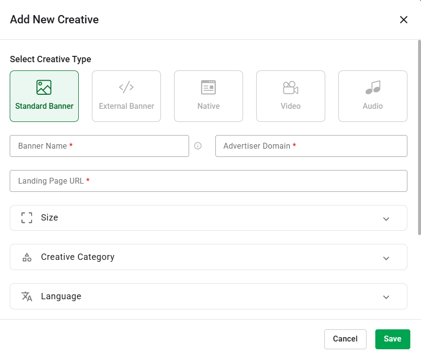 - Creative Type: Select Creative Type. Currently, only the Standard Banner type is available and is selected by default. Other creative types (Native, Video, Audio) are currently disabled.